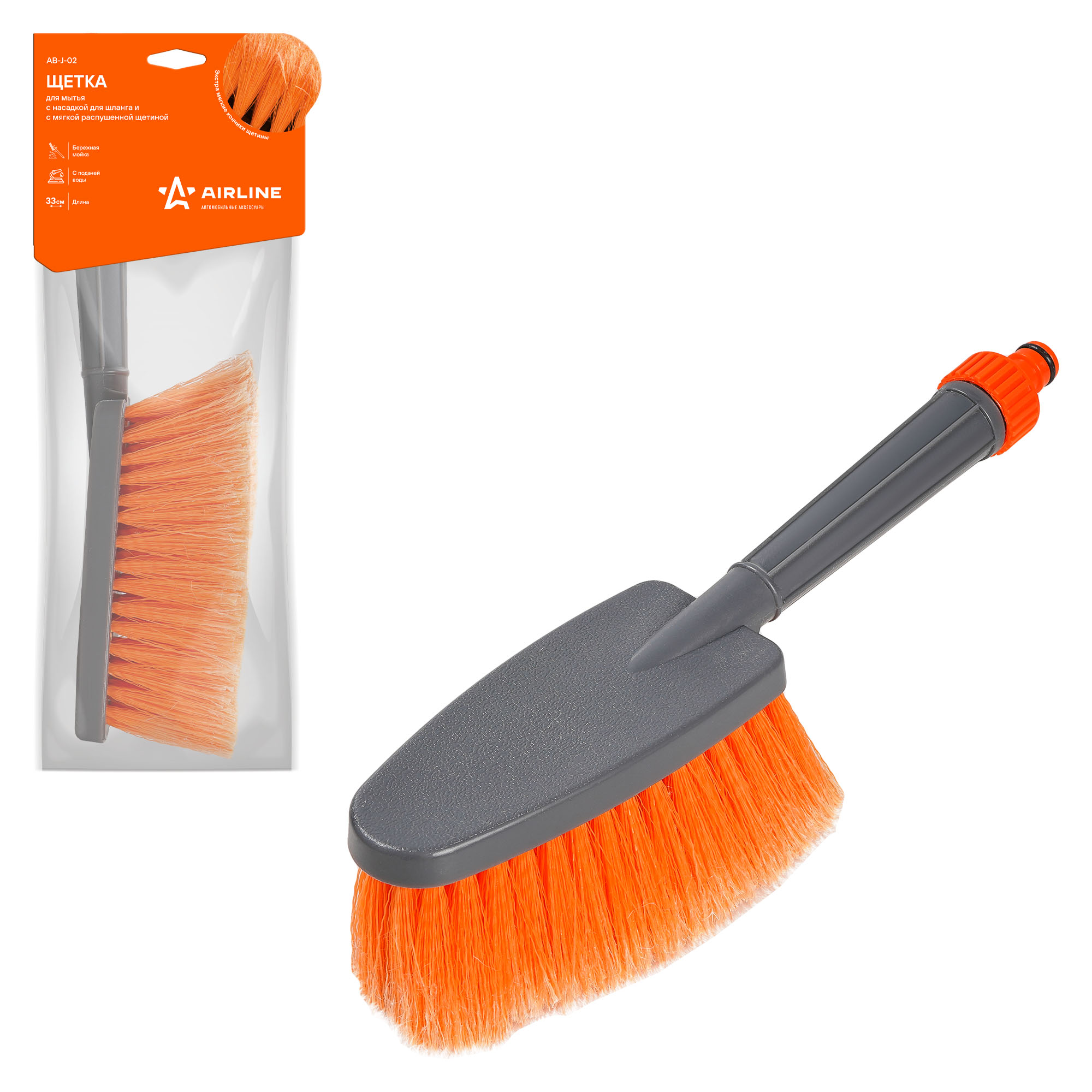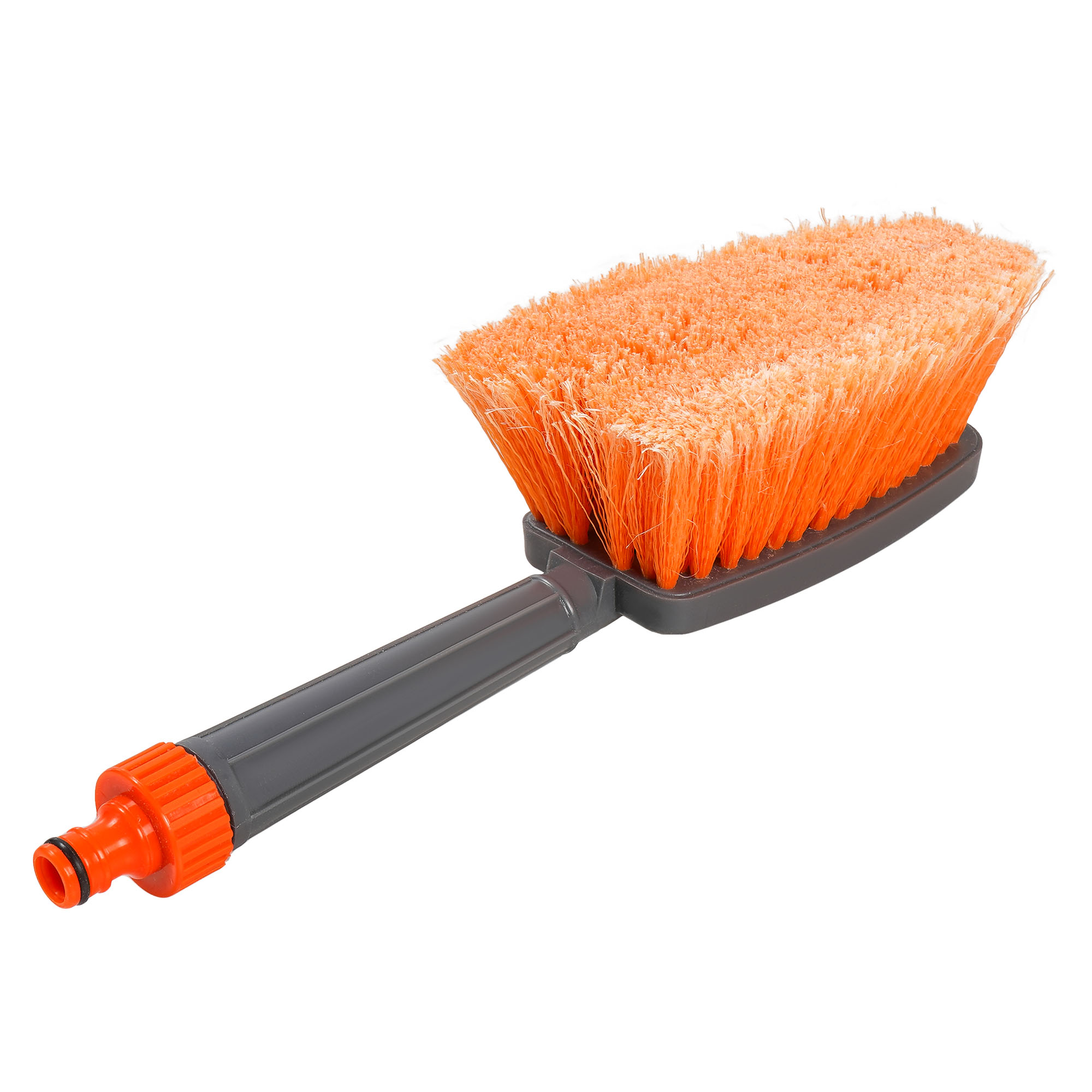 Компактная пластиковая щетка серого цвета для мытья автомобиля поможет очистить машину от загрязнений. Диаметр щетины щетки составляет 0,3 мм и имеет мягкие распушенные кончики. Рабочая поверхность изделия имеет ворс средней длины, а также оранжевую окраску. Со стороны ручки у изделия расположена насадка для подключения шланга с водой.